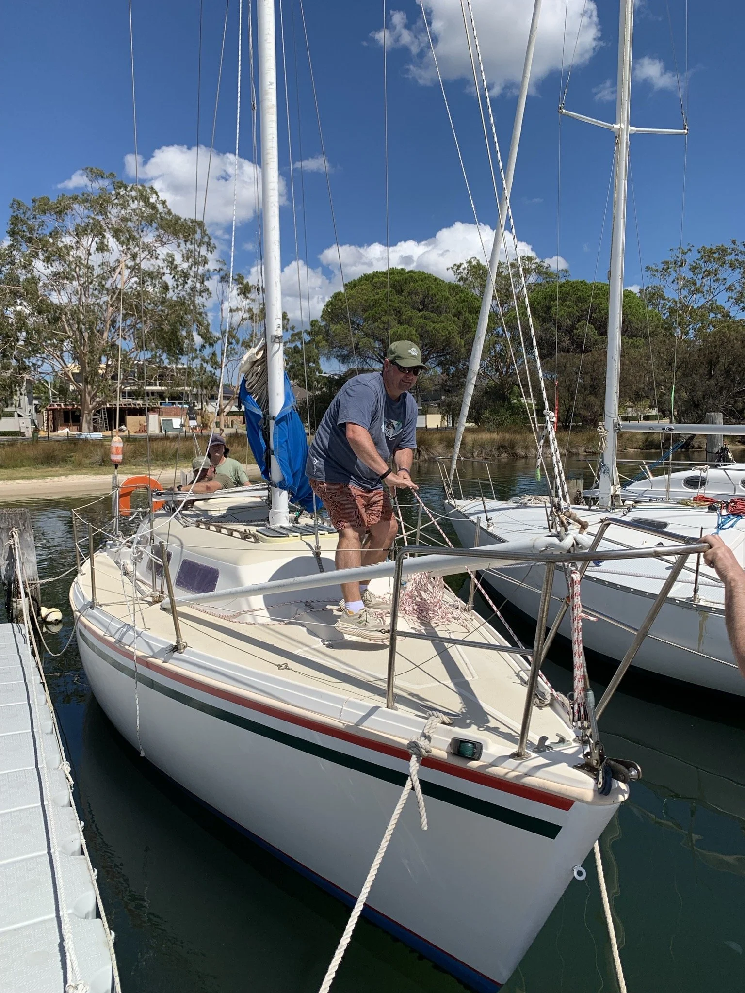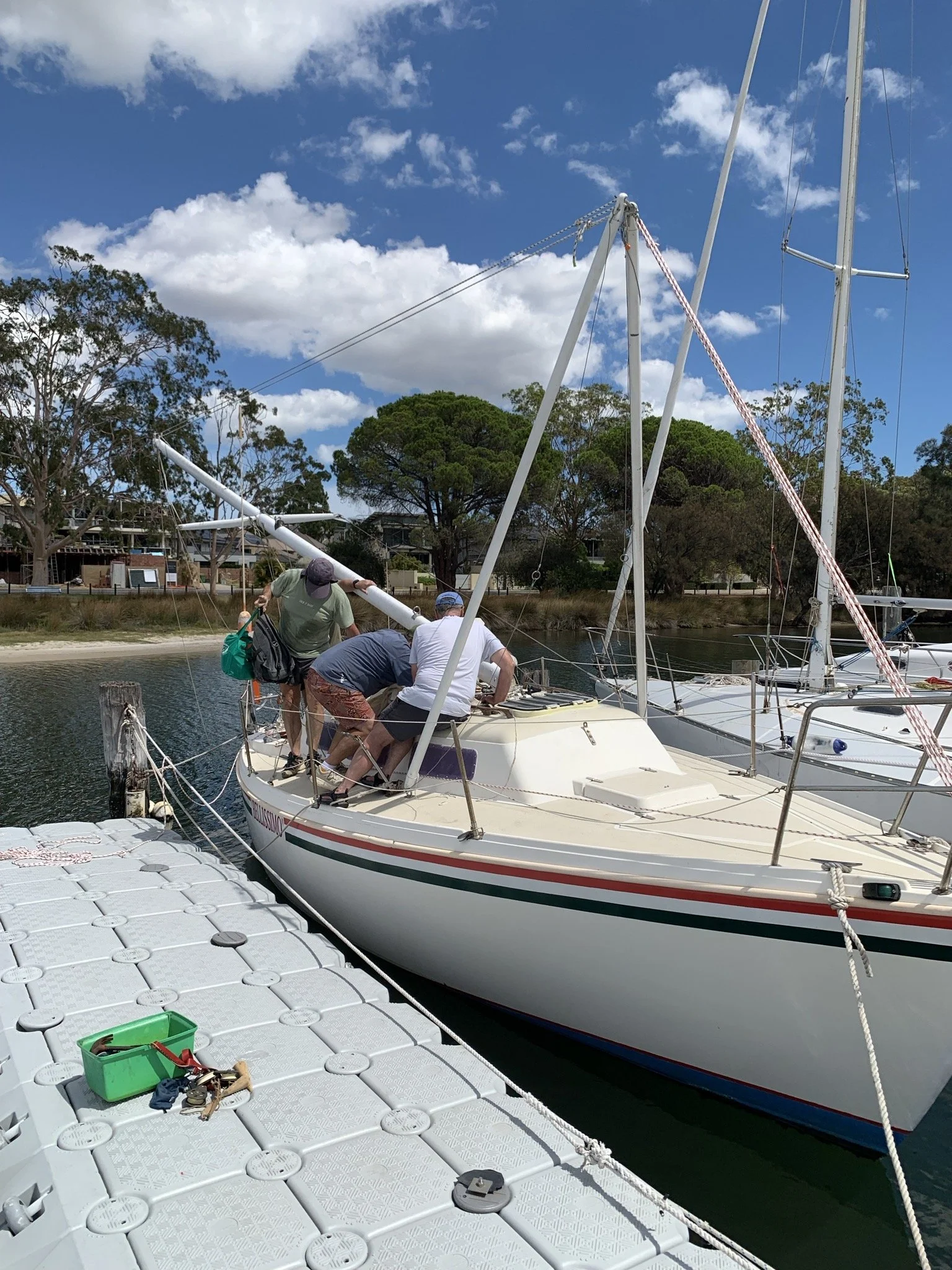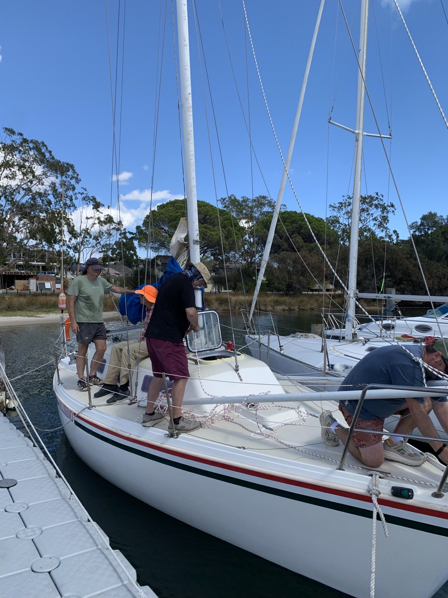 Once done, and after realising that there was a baby stay that needed to be taken off as well 🤦♂️, we were able to lower the mast back to rest on a cradle placed at stern. Sounds simple but there was a lot of huffing and puffing going on.
