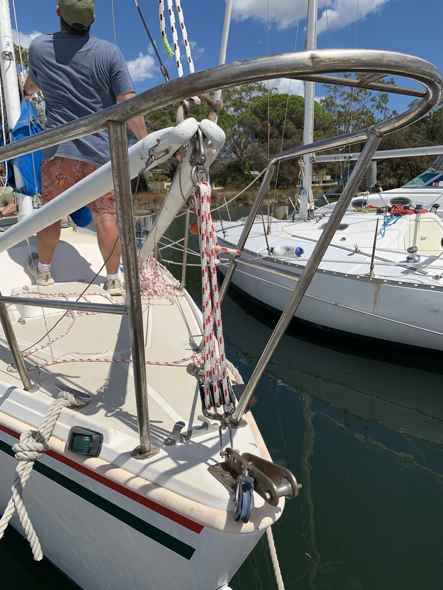 Once successfully lowered we realised that the boom related blocks (vang, outhaul and reefing lines) were all trapped under the mast. Well, actually we realised after hearing the gel coat crack….